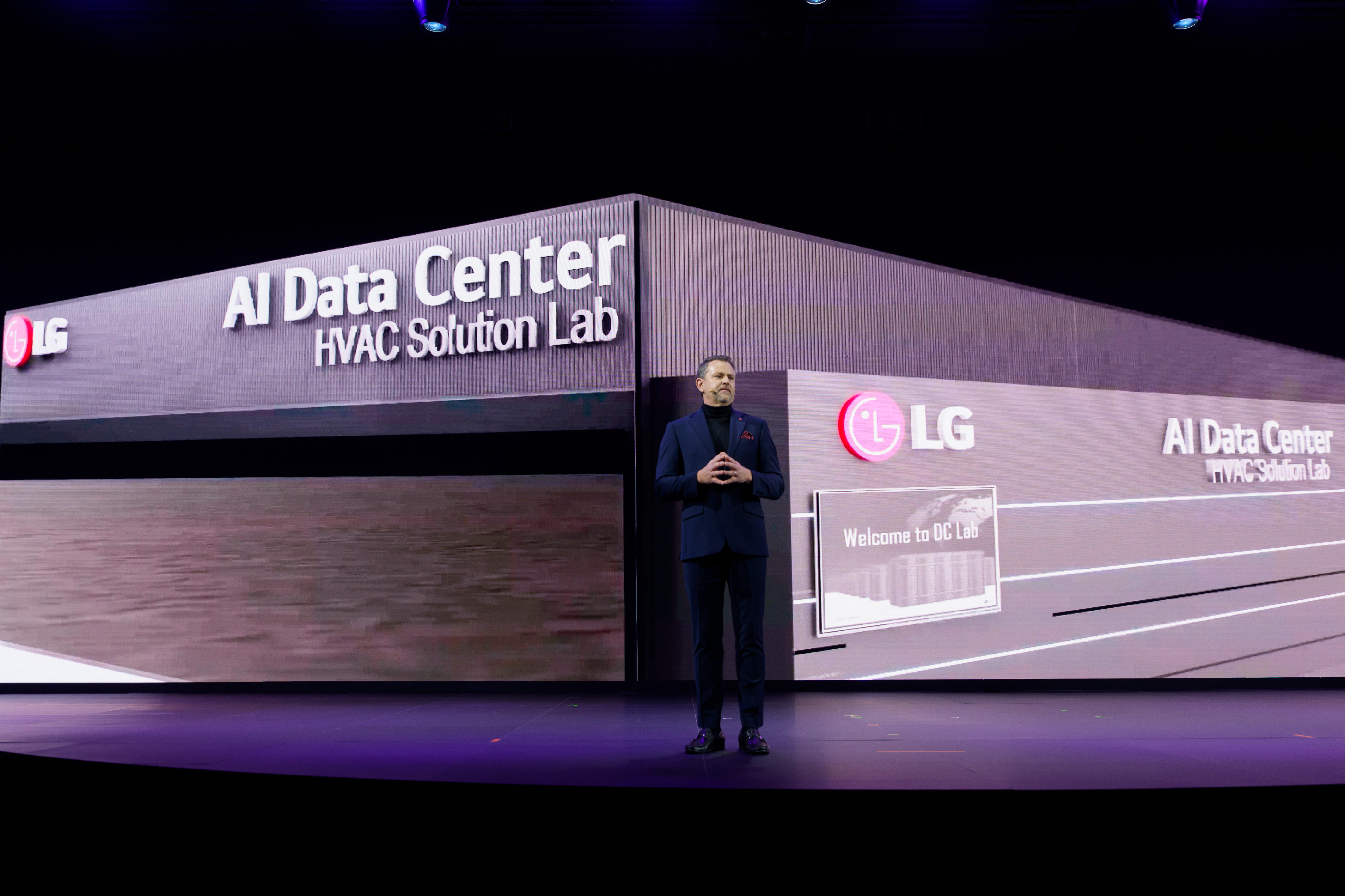 Steve Scarbrough, Sr. Vice President Eco Solutions Sales LG Electronics US, discusses the expansion of AI-driven solutions beyond the home to drive meaningful change across vehicles, workplaces and commercial facilities during the CES 2026 news conference Monday, Jan. 5, 2026 in Las Vegas. (Jack Dempsey/AP Content Services for LG)